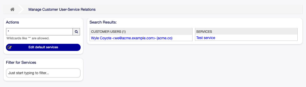 Multiple customer users or services can be assigned in both screens at the same time. Additionally clicking on a customer user or clicking on a service in the relations screen will open the Edit Customer User screen or the Edit Service screen accordingly.