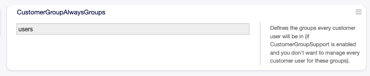 To enable this feature in systems using a directory server or multiple non-default back ends, a custom configuration file needs to be placed in Kernel/Config/Files (for example named ZZZ_CustomerBackend.pm). Once activated, all customer users from this back end will require group assignment.