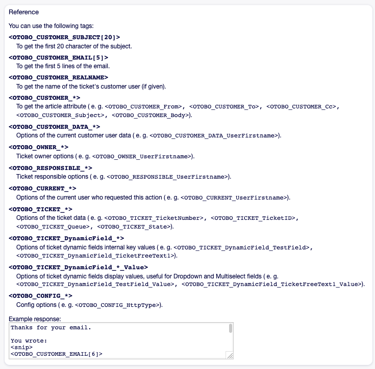 For example, the variable <OTOBO_TICKET_TicketNumber> expands to the ticket number allowing a template to include something like the following.