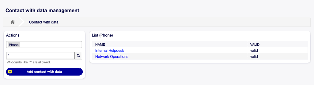 Namewird nicht benötigt). - Füllen Sie die Datenquelle, indem Sie mindestens einen Kontakt in der neu erstellten Datenquelle hinzufügen, indem Sie Tickets → Kontakte mit Daten bearbeiten aus der Hauptnavigationsleiste verwenden.