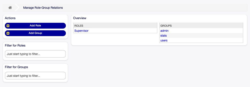 Verwenden Sie diese Ansicht, um eine oder mehrere Rollen zu einer oder mehreren Gruppen zuzuordnen. Um diese Funktion zu nutzen, muss mindestens eine Rolle und eine Gruppe dem System hinzugefügt werden. Die Ansicht zur Verwaltung ist im Modul Rollen ↔ Gruppen in der Gruppe Benutzer, Gruppen & Rollen verfügbar.