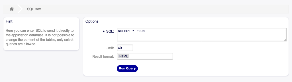 The SQL statements entered here are sent directly to the application database. By default, it is not possible to change the content of the tables, only SELECT queries are allowed.