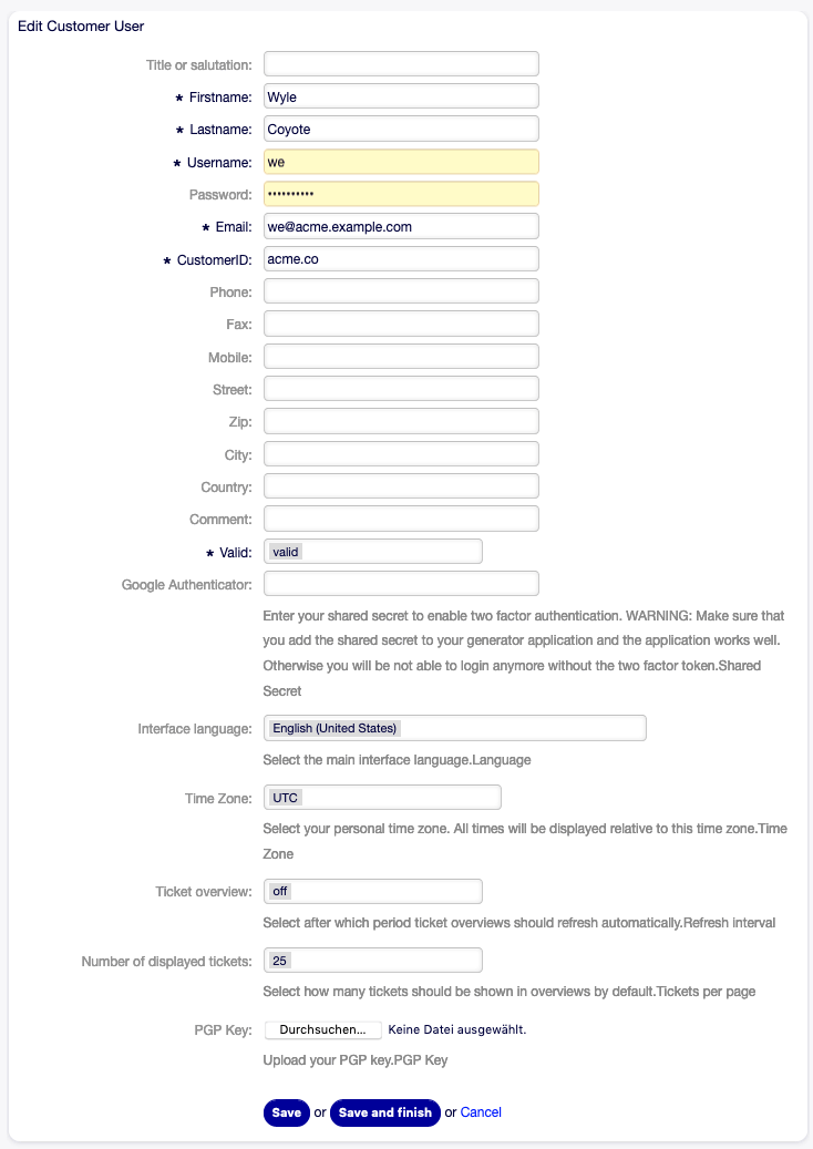 Use this screen to add a customer user to the system. A fresh OTOBO installation contains no customer users by default. The customer user management screen is available in the Customer User Administration menu item of the Customers menu.