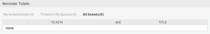 • Meine verantwortlichen Tickets: Tickets, denen der Agent als Verantwortlicher zugeordnet ist (Benötigt die aktivierte Einstellung Ticket::Responsible).
