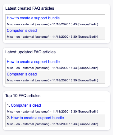 Die Widgets in der rechten Seitenleiste listen alle kürzlich erstellten FAQ-Artikel, geänderten FAQ-Artikel und die Top 10 FAQ-Artikel auf.